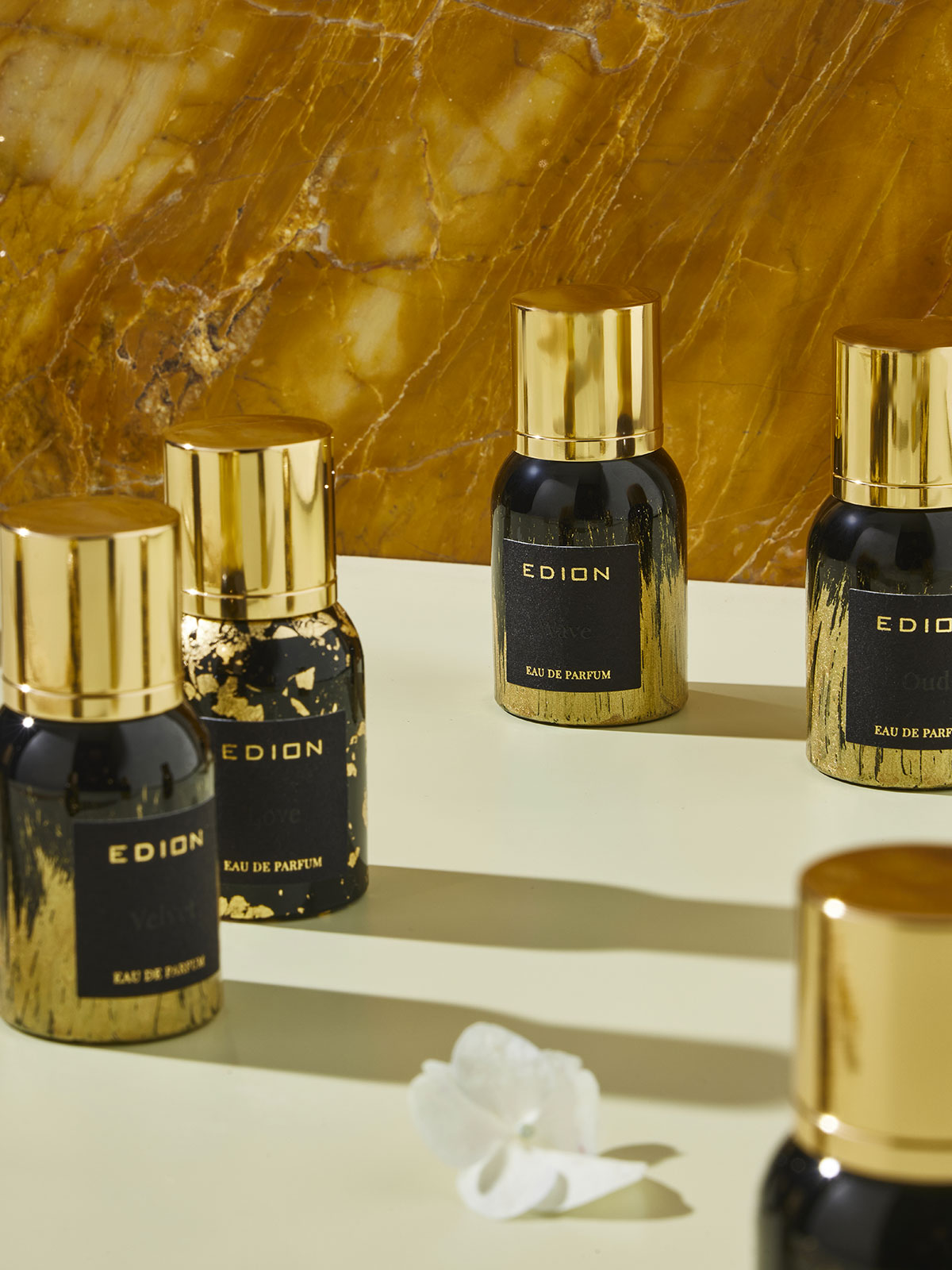 The Edion eau de parfum in a black glass bottle, with gold leaf, is a jewel of elegance and refinement.