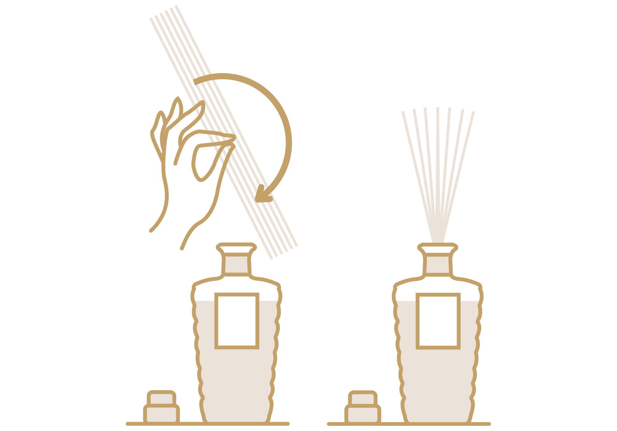 I bastoncini sono forniti per ogni bottiglia. Per consentirne una maggiore diffusione, lasciarli impregnare bene per 12 ore circa. Per una diffusione costante, girarli una volta al giorno. Tenere lontano da fonti dirette di luce e di calore.